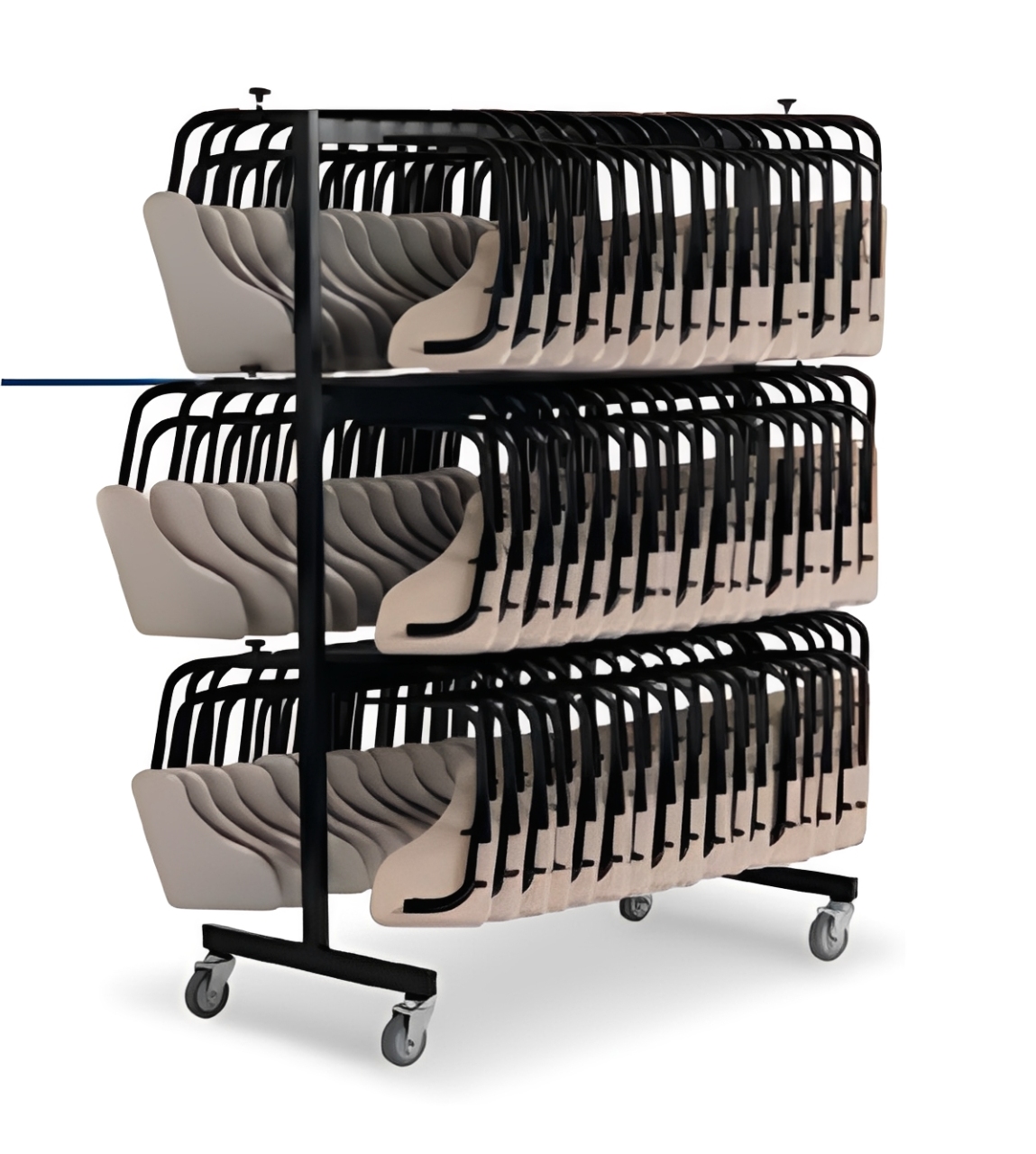 Carrinho compacto e funcional, ideal para instituições de ensino, auditórios e anfiteatros que necessitam organizar e movimentar grandes quantidades de braços universitários com praticidade e segurança.