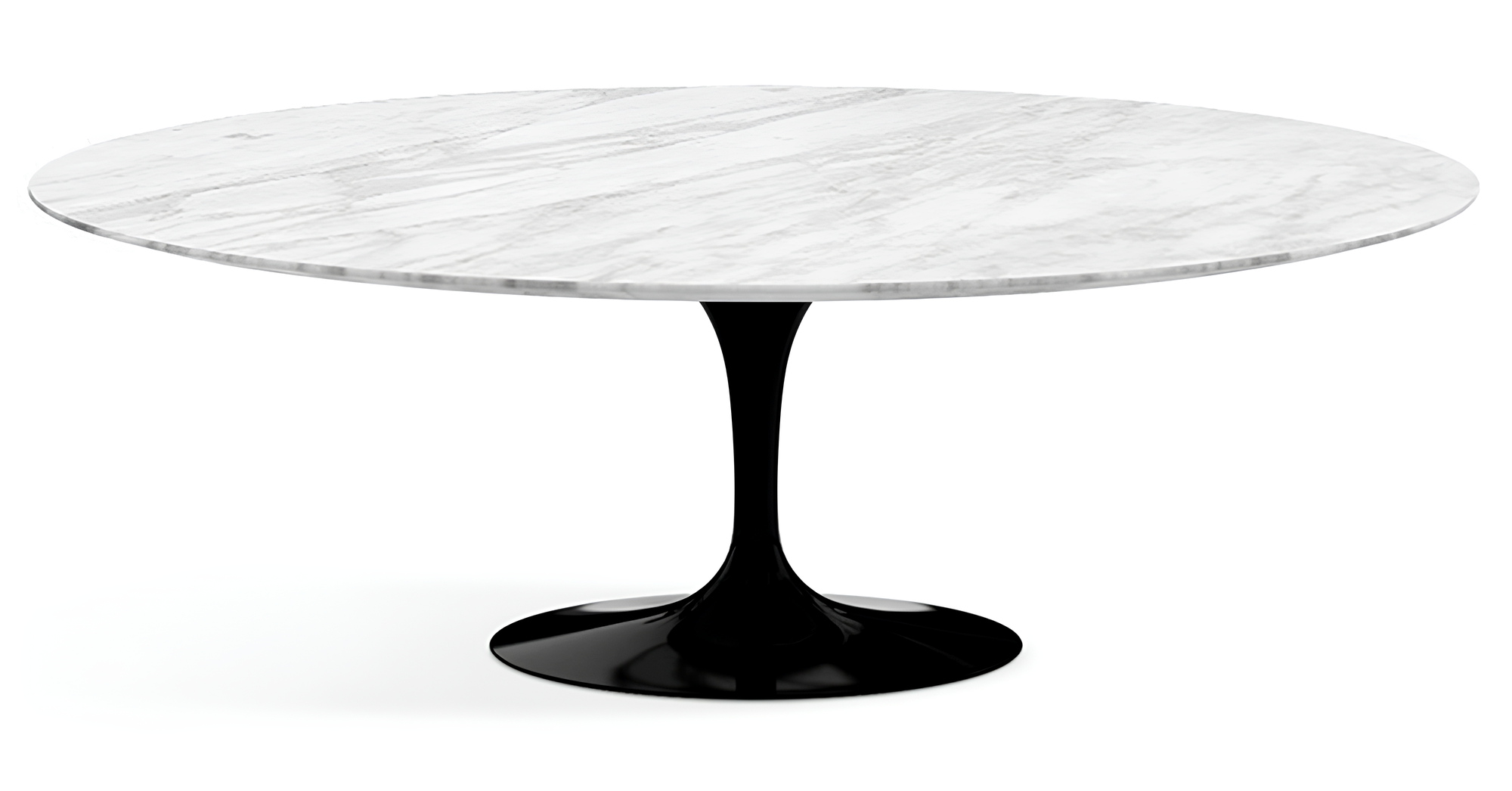 Especificações: Mesa tulipa oval com base tipo taça em alumínio fundido e pintura automotiva PU, tampo laminado em mármore branco extra com acabamento chanfrado nas bordas, com contra tampo em MDF laqueado.